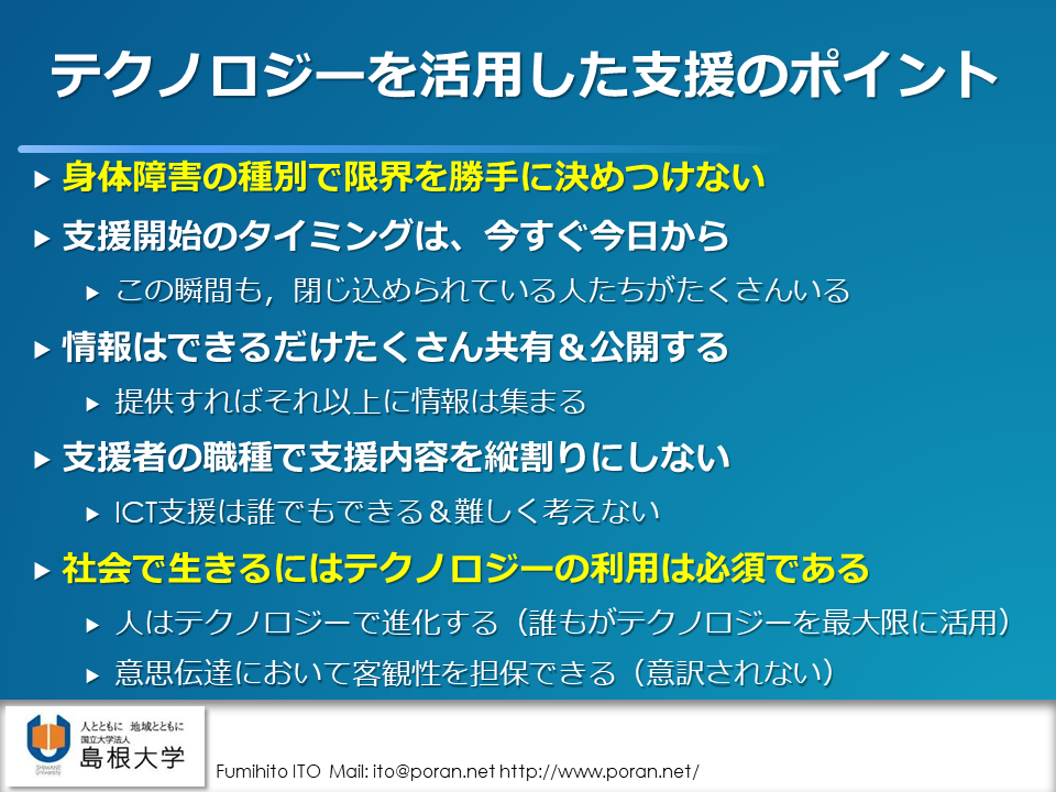 【スライドのみ】(3 of 3)重度障害者の「ICT活用」とは? 2018年4月7日 最終更新日時 : 2018年4月7日 Fumihito ITO FacebookXBlueskyCopyViews: 1139(メモ)ただいま,ページ作成中です。 【スライドのみ】(1 of 3)重度障害者の「ICT活用」とは? 【スライドのみ】(2 of 3)重度障害者の「ICT活用」とは? 【スライドのみ】(3 of 3)重度障害者の「ICT活用」とは? FacebookXBlueskyCopy