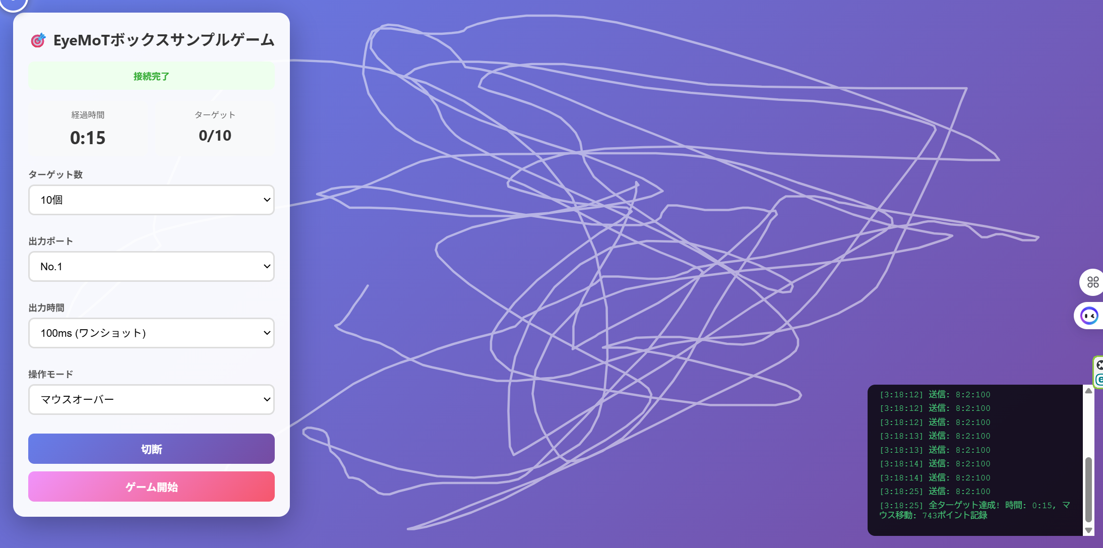 EyeMoTボックスのサンプルゲームです。 AIがEyeMoTボックスの通信仕様を学習してゲーム化しました。