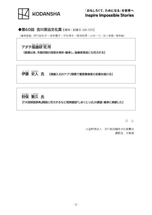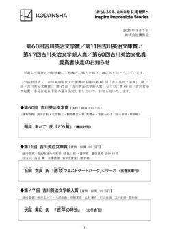 - 第60回吉川英治文学賞/第11回吉川英治文庫賞/第47回吉川英治文学新人賞/第60回吉川英治文化賞受賞者決定のお知らせ(講談社)