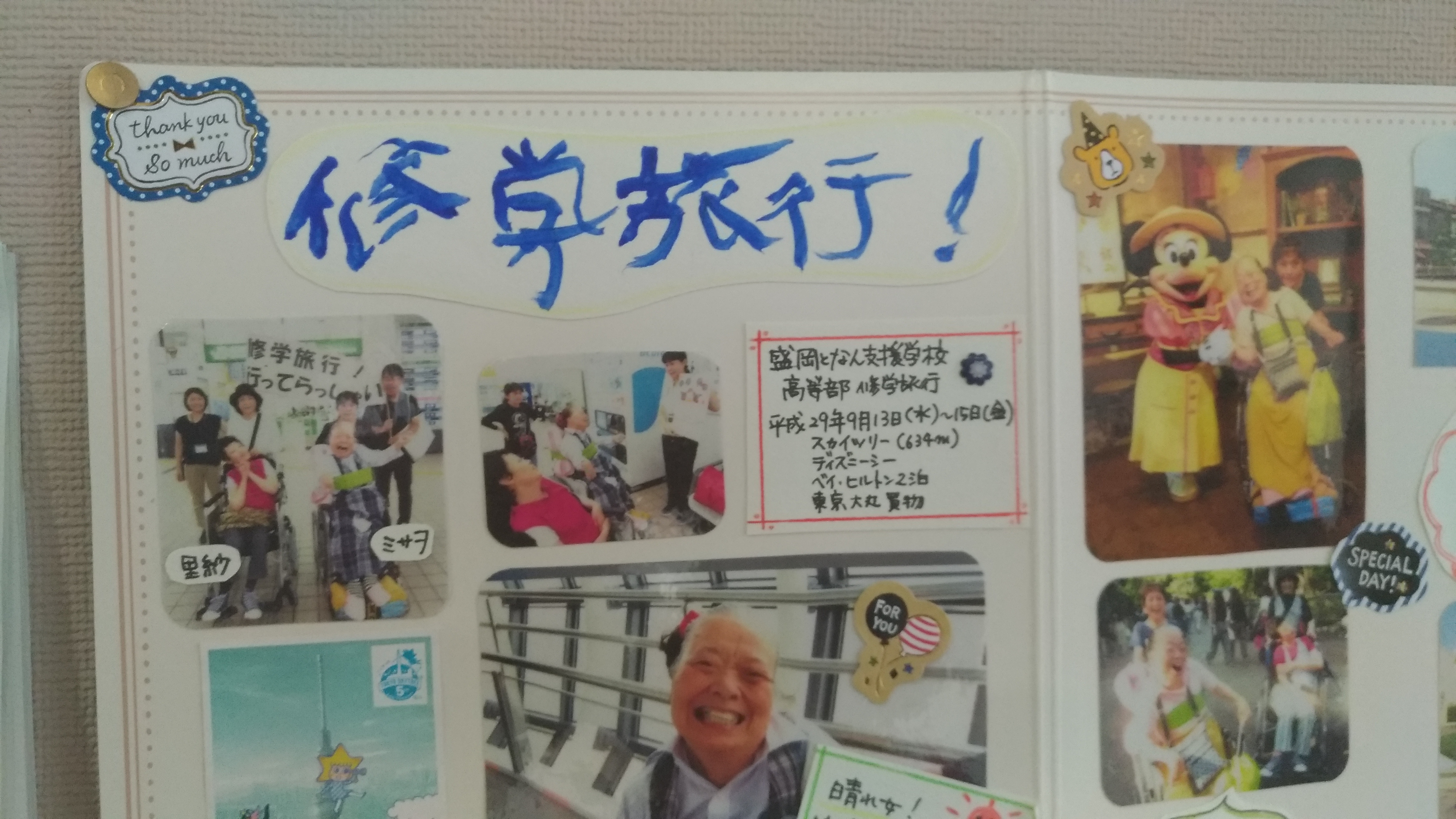 76歳の女子高生(2年生)である板倉ミサヲさん,無事高校3年生になれそうです。修学旅行も楽しんで,もうほんとうの女子高生ですね。この壁新聞のタイトル「修学旅行!」はミサヲさんが口でくわえたペンで書いたそう。そう,ミサヲさんの手の代替は口なのです。